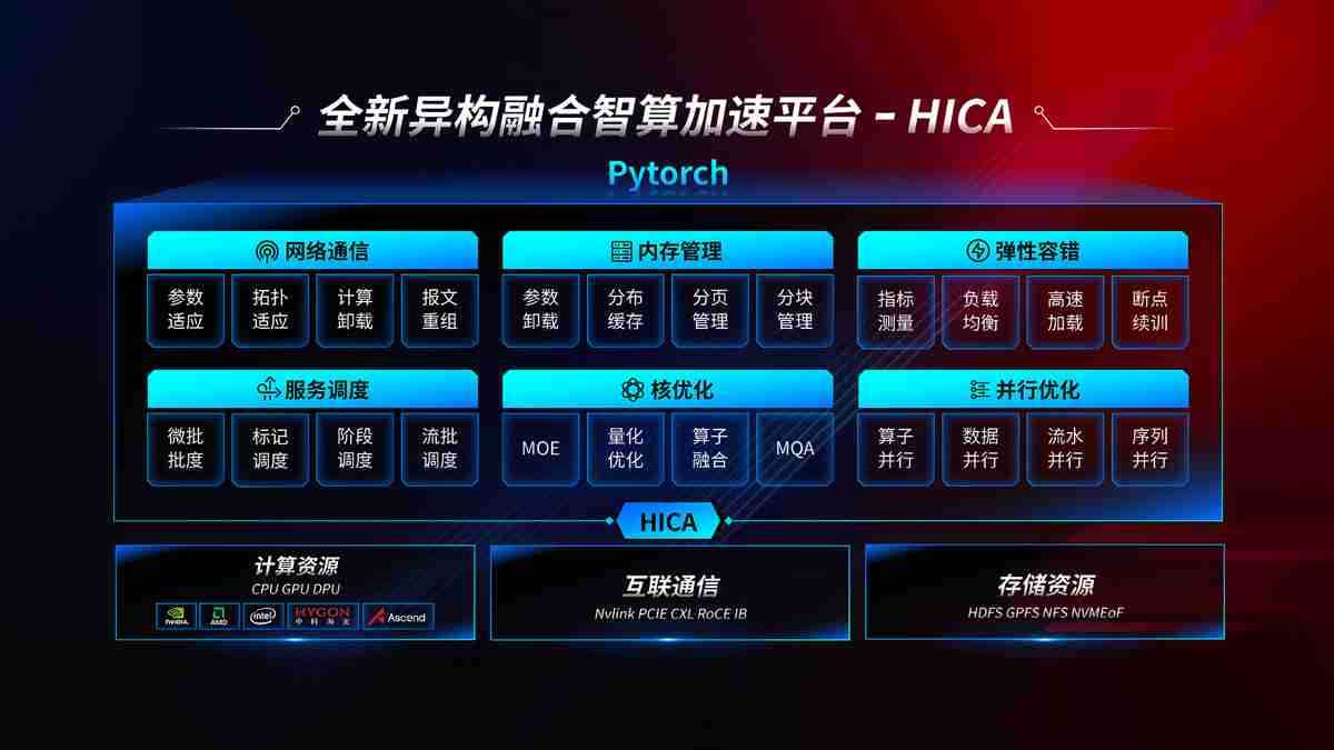 通过自研的服务层、、、中间适配层、、以及调度编排算法,,,,采用数据并行、、、、模型并行等多种并行方式,,把并行计算任务进行有效的分解,,,,使其分别由相应的软件栈和算力资源来承接。。当GPU资源变化,,,HICA可以实时动态调度计算子任务并调整模型拓扑和架构,,,以充分聚合各种算力资源。。
